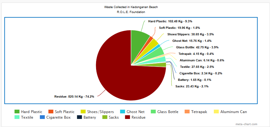 Within approximately one hour, the cleanup yielded about 1,105.1 kilograms of non-organic waste. More than 70% of the total was categorized as residual waste, consisting of materials that were heavily damaged or contaminated and therefore unsuitable for processing at our facility. This portion will be transported to a landfill for appropriate handling and disposal. Glass bottles made up a notable share of the collection, reaching nearly 42 kilograms. These materials will be treated at our center, with part of the volume redirected to a waste bank to enhance recycling efficiency. Hard plastics—such as bottles, cups, and styrofoam—accounted for roughly 9.3% of the total and will also be processed through the waste bank for recycling. Soft plastics and miscellaneous items, including shoes and sandals, represented a smaller proportion of the waste recovered during the activity.